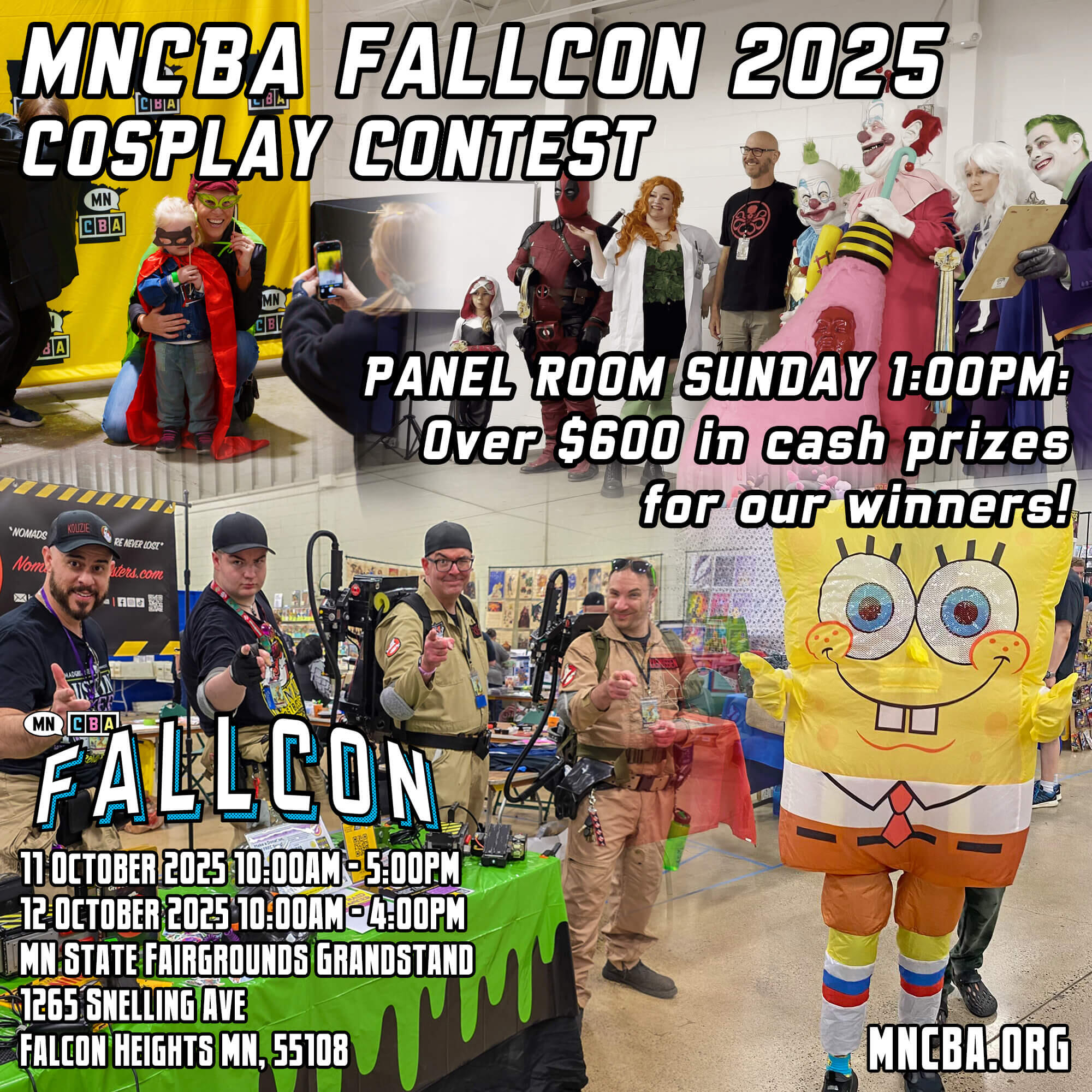 The MNCBA FallCon 2025 Cosplay Contest features four categories to compete in — Youth, Novice, Advanced, and Group — with over $600 in total cash prizes for our winners! Visit our Cosplay Contest page to learn more, then register by 12:00PM on Sunday at the Nomad Ghostbusters of Minnesota booth!